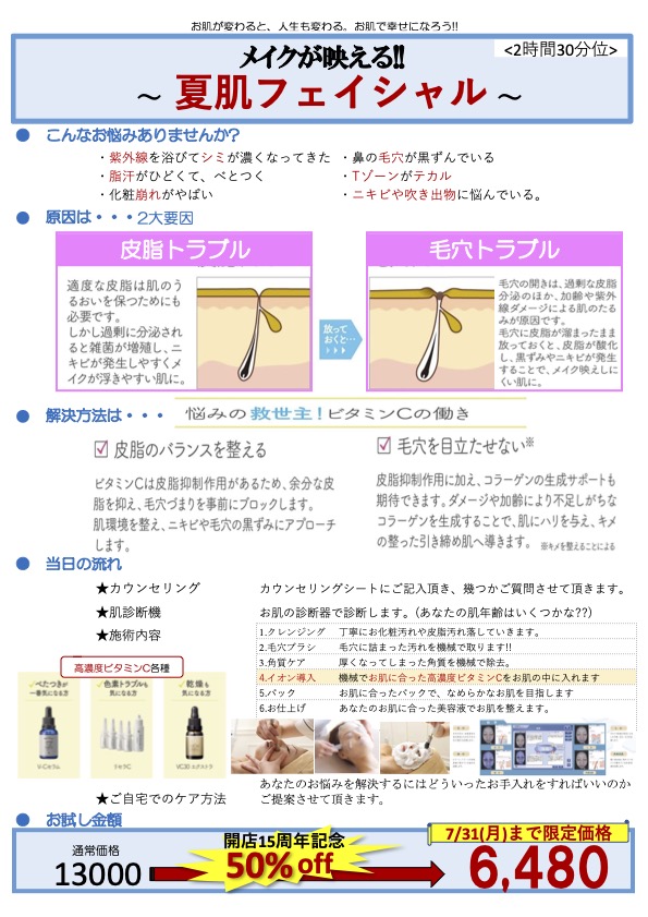 2023年「夏肌フェイシャル」7月1日〜スタート!! お知らせ 2023年06月30日 夏は汗や皮脂が多く分泌され、べたつきやすくメイク崩れがしやすい時期です。 そんな時には「ビタミンC」アイテムで夏特有の悩みをぶろっくし、メイクくずれ知らずの肌を目指しませんか?? コメント投稿フォーム コメントをキャンセルメールアドレスが公開されることはありません。 ※ が付いている欄は必須項目ですコメント ※ 次回のコメントで使用するためブラウザーに自分の名前、メールアドレス、サイトを保存する。 【パーソナルフェイス診断】パーソナルカラー×肌診断の二種類!! 肌診断機でお肌の状態を知ろう!