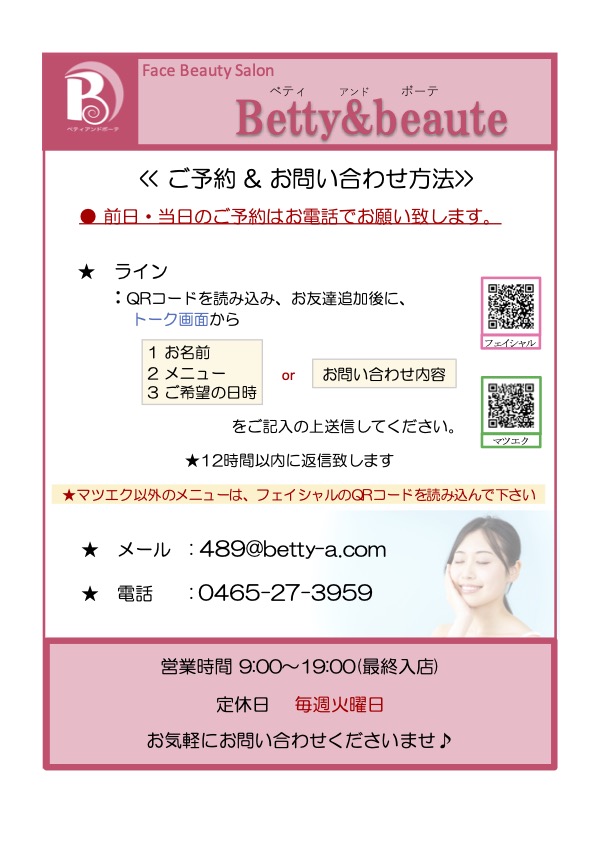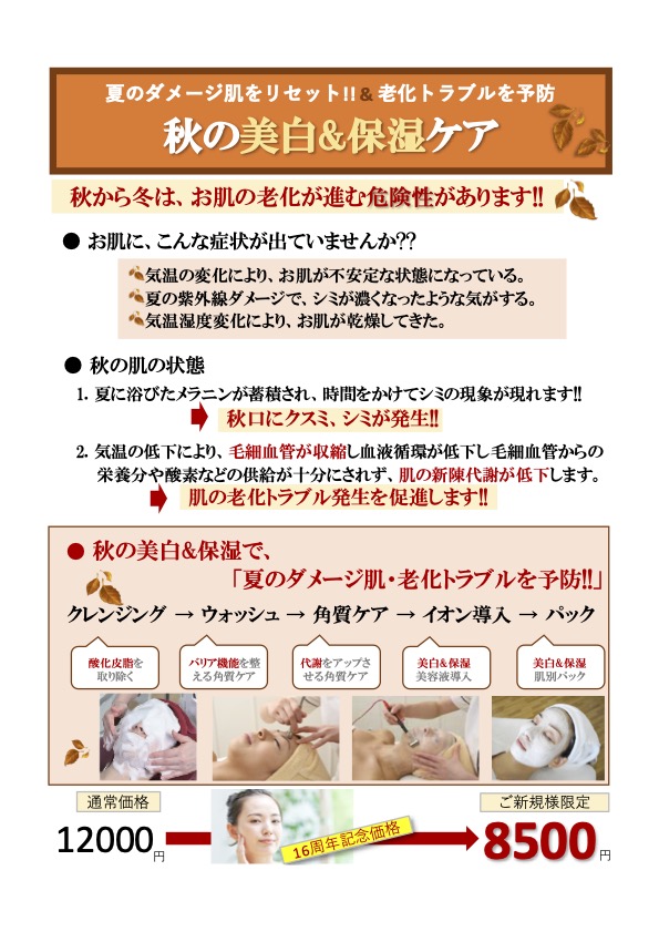 2023年9月キャンペーン「秋の美白&保湿ケア」 お知らせ 宣伝 2023年09月08日 2023年秋2P予約J すぐにご予約したい方 ↓↓↓↓↓↓↓↓↓↓↓↓↓↓↓↓ コメント投稿フォーム コメントをキャンセルメールアドレスが公開されることはありません。 ※ が付いている欄は必須項目ですコメント ※ 次回のコメントで使用するためブラウザーに自分の名前、メールアドレス、サイトを保存する。 当店と「美容クリニック」でのしみケアの違いについて 秋のヘッド顔頭・美肌リンパマッサージ〜キャンペーン2023年11月17日迄