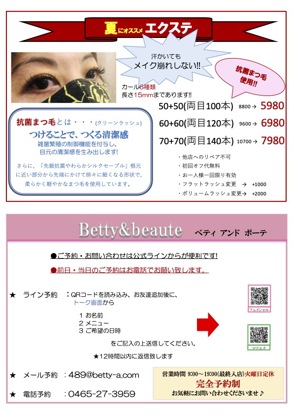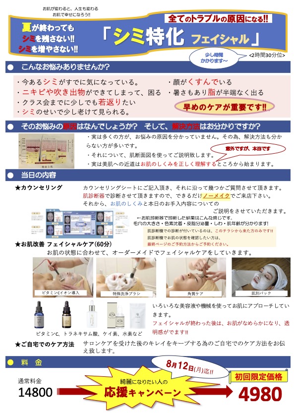 シミ特化フェイシャル 〜2024年8月12日迄〜 お知らせ 宣伝 2024年07月31日 コメント投稿フォーム コメントをキャンセルメールアドレスが公開されることはありません。 ※ が付いている欄は必須項目ですコメント ※ 次回のコメントで使用するためブラウザーに自分の名前、メールアドレス、サイトを保存する。 【ご新規様初回限定】マツエク 「肌改善フェイシャル」赤み・敏感・ニキビ・シミ・しわ・毛穴が気になる方へ